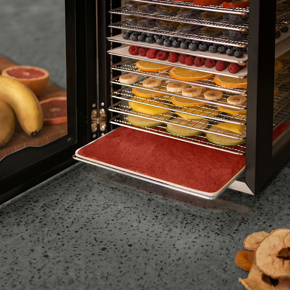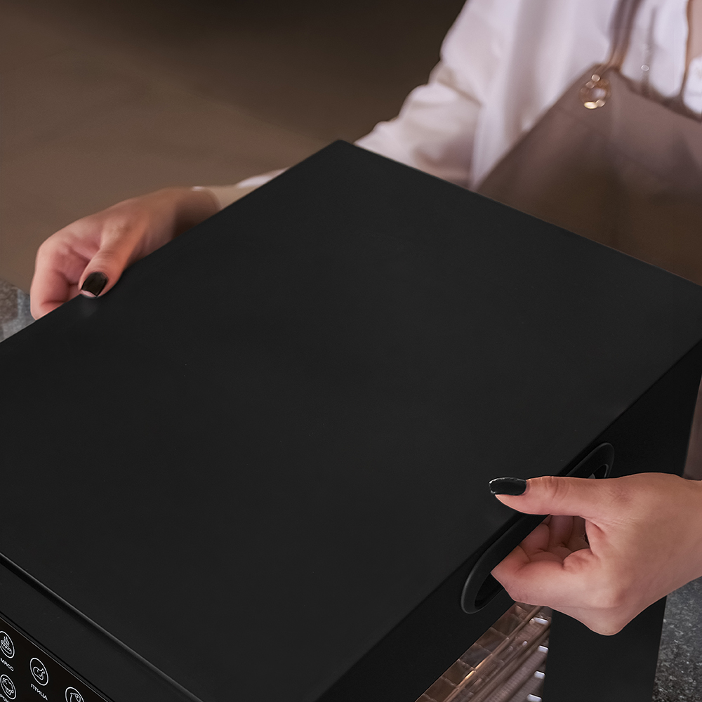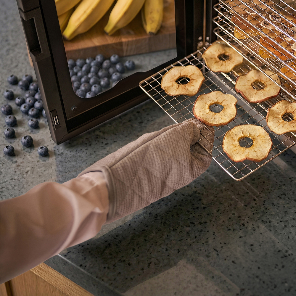 Чёрный корпус из нержавеющей стали, устойчивый к нагреву, влаге и коррозии, выглядит лаконично и современно, легко вписывается в интерьер кухни или мастерской. Внутри установлено 20 поддонов из нержавеющей стали с зазором 25 мм — этого достаточно, чтобы удобно размещать ломтики фруктов, травы или мясные полоски